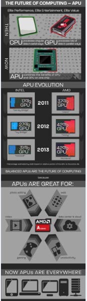 AMD considera que ha llegado la hora de que más personas conozcan las APUs, entiendan cómo han sido desarrolladas y lo que significan para el consumidor de hoy en día. Con este fin, ha creado esta infografía que “cuenta la historia” de las APUs – el futuro de la informática y un importante segmento para la categoría de potencia de procesamiento y rendimiento.