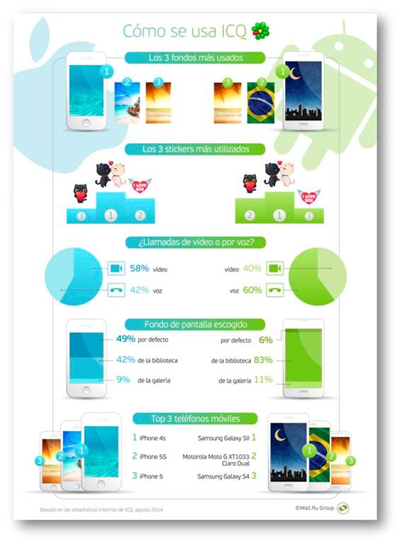 Mail.ru desvela hoy una interesante infografía sobre el uso del programa de mensajería ICQ, y muestra algunas curiosidades del comportamiento de los usuarios de los sistemas iOS y Android con este tipo de apps; por ejemplo, ante una llamada gratuita por voz, o una videollamada, también gratuita, los usuarios de iOS eligen mayoritariamente el uso de videollamadas, al contrario que los usuarios de Android; o que los usuarios de Android personalizan su app con mucha mayor frecuencia que los usuarios de iOS.