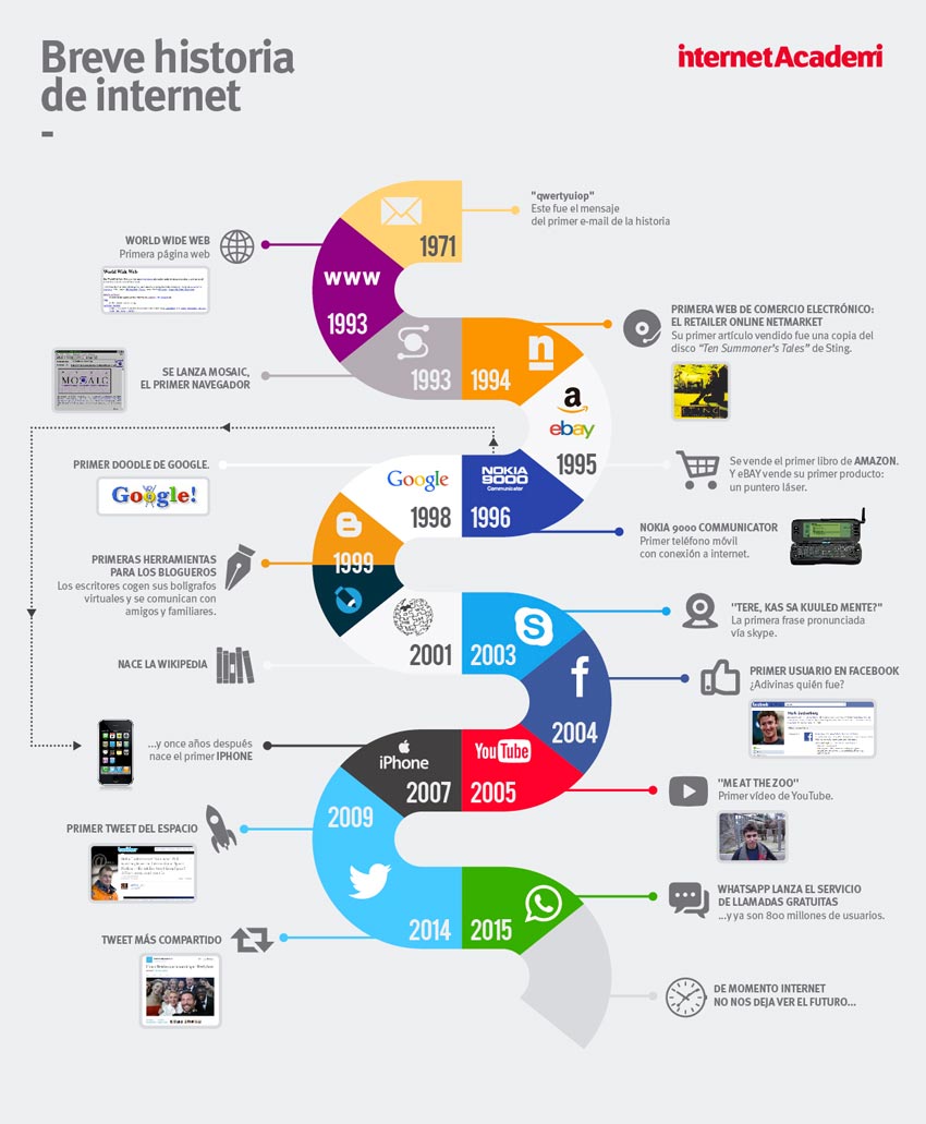 Además, internetAcademi ha diseñado una infografía que resume la historia de internet recorriendo sus principales hitos, desde el primer mensaje del primer e-email de la historia, en 1971; hasta el lanzamiento de llamadas gratuitas de Whatsapp.