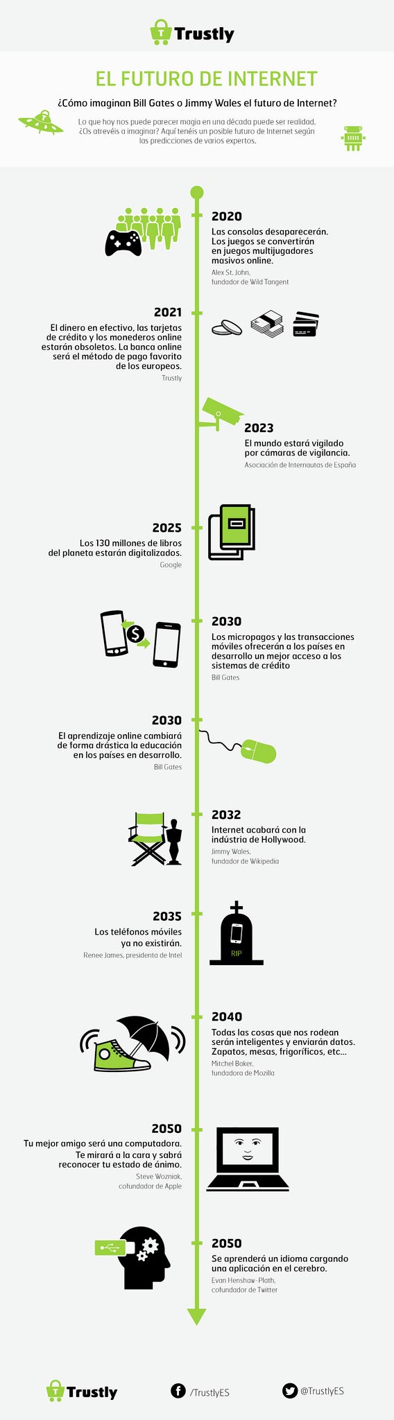 Por eso Trustly, para el Día Mundial de Internet, se plantea en esta infografía cómo será Internet y cómo evolucionarán los dispositivos conectados en los próximos 45 años en base a las proyecciones de distintos expertos. Habrá que ver cuáles se cumplen.