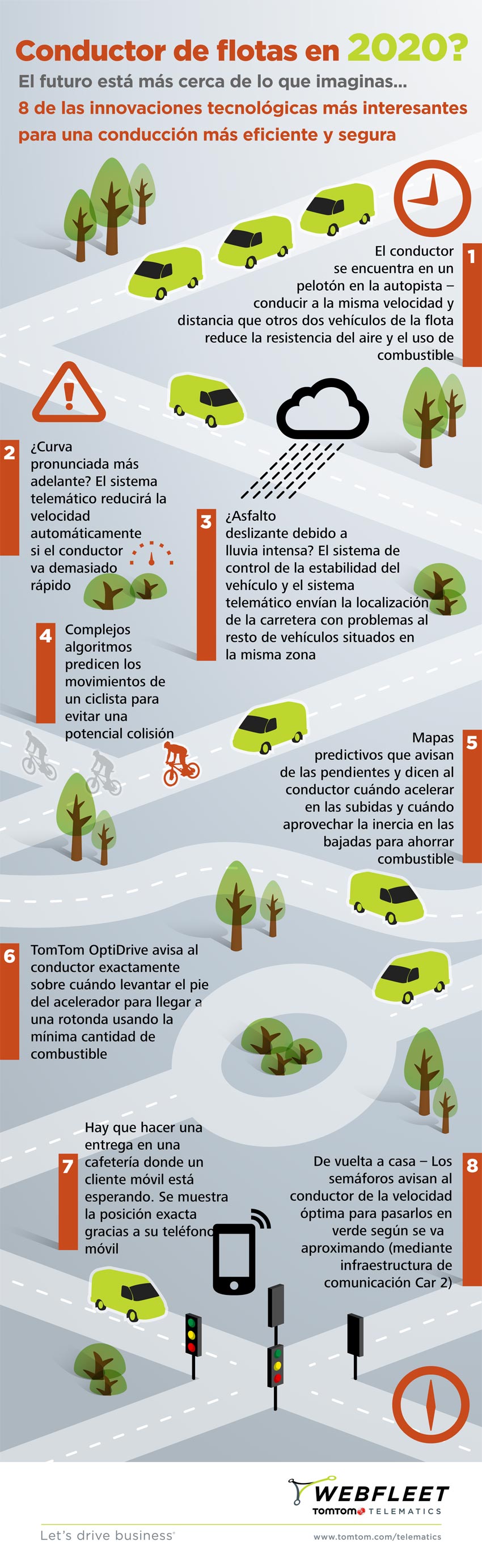 TomTom Telematics ha compartido una infografía donde se repasan algunas tecnologías, innovadoras y sofisticadas, que están actualmente en desarrollo y cuyo objetivo es promover un estilo de conducción más eficiente y seguro en el ámbito profesional.