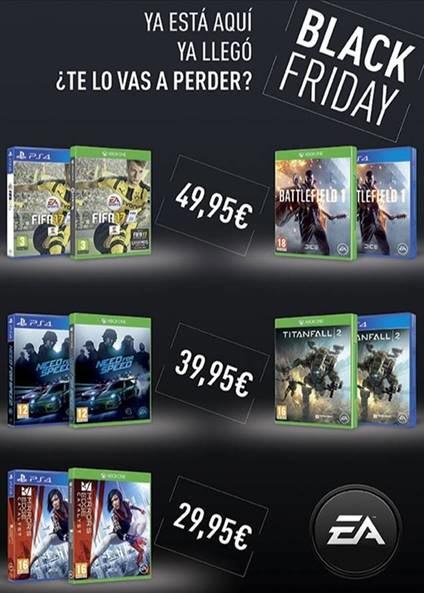 Electronic Arts anuncia los títulos que entran en la promoción del Black Friday con interesantes ofertas disponibles hasta el 27 de noviembre. Aprovecha esta excelente oportunidad para hacerte con los últimos lanzamientos de EA y vivir los albores de la guerra total en Battlefield 1, formar un tándem imbatible con tu titán en Titanfall 2 o convertirte en una súper-estrella del fútbol en EA SPORTS FIFA 17.