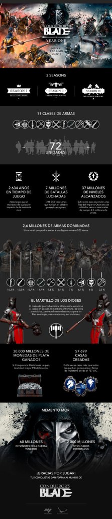 Booming Games también ha lanzado una infografía especial con varios de los hitos de Conqueror’s Blade, conforme ha crecido y evolucionado durante sus tres temporadas. Esta incluye la undécima clase de arma, nuevas unidades y mapas, así como sus frecuentes actualizaciones de contenidos.