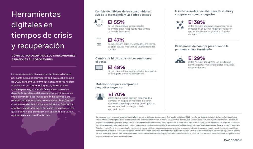 Facebook en colaboración con Deloitte, ha presentado los resultados del estudio Herramientas digitales en tiempos de crisis y recuperación, que muestra el cambio de hábitos sufrido por los consumidores españoles durante la pandemia y el papel esencial que ha tenido la tecnología.