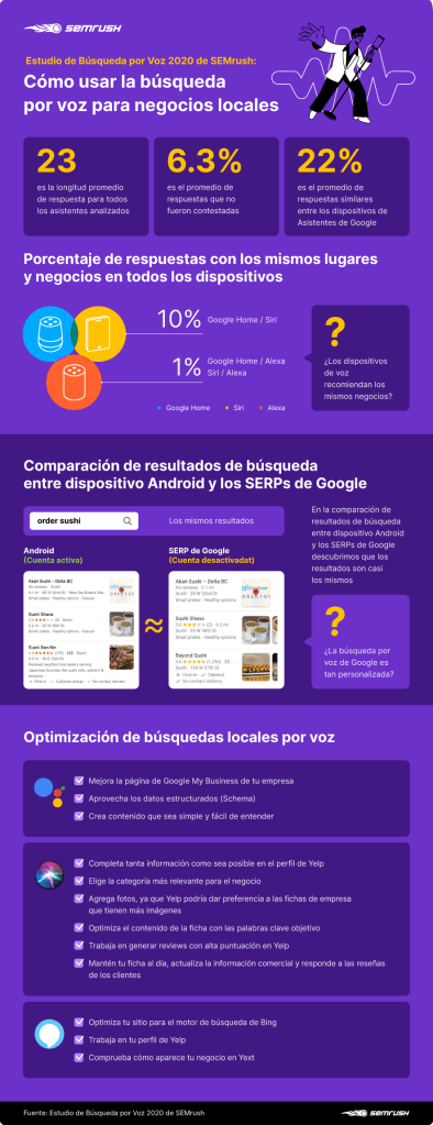 A medida que la búsqueda por voz se extiende, el mercado sigue introduciendo más y más asistentes virtuales. Por eso, SEMrush, una plataforma SaaS (software como servicio) líder en gestión de visibilidad online y marketing de contenidos, no solo ha centrado este año su estudio sobre este ámbito en los dispositivos de Google, sino que ha añadido otros como Siri y Alexa para cubrir casi el 100% del mercado de asistentes de voz, y comprender cómo se comparan los mismos entre sí cuando se trata de resultados sobre negocios locales y descubrir los algoritmos que hay detrás de ellos.