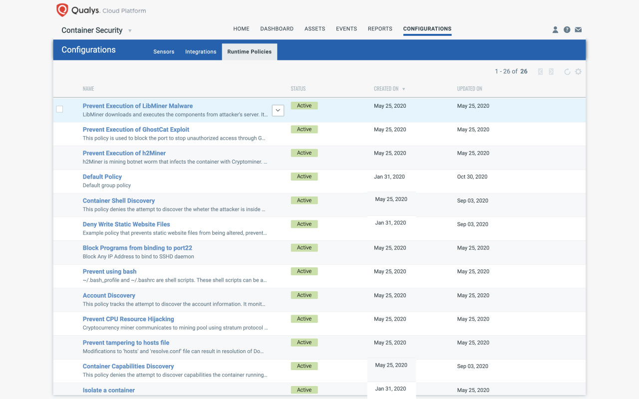 Construido sobre Qualys Cloud Platform, Qualys Container Security descubre, rastrea y asegura los contenedores desde su construcción hasta el tiempo de ejecución. Container Security marca y responde continuamente a los problemas de seguridad y cumplimiento en los contenedores a través del entorno de TI híbrido. La incorporación de la protección en tiempo de ejecución amplía estas capacidades, ofreciendo una visibilidad completa y granular de los contenedores en ejecución y la capacidad de aplicar las políticas que rigen el comportamiento de los contenedores. Como resultado, puede detectar inmediatamente y actuar sobre los contenedores que se están alejando de sus imágenes principales y que potencialmente suponen un riesgo de seguridad debido a las vulnerabilidades o a las configuraciones erróneas.