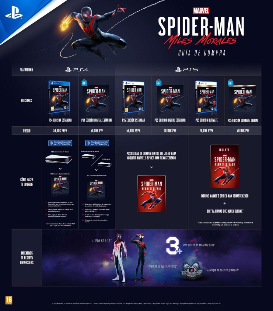 PlayStation® España pone a disposición de todos los jugadores la guía de compra de Marvel’s Spider-Man: Miles Morales, el esperado videojuego exclusivo AAA del superhéroe arácnido para PlayStation®5 (PS5) y PlayStation®4 (PS4) que estará disponible el próximo 12 de noviembre. Gracias a esta infografía, disponible en los archivos adjuntos, los jugadores podrán conocer las diferentes opciones de compra disponibles en el momento en el que vayan a adquirir su edición favorita del juego, ya sea para PlayStation®5 o PlayStation®4.