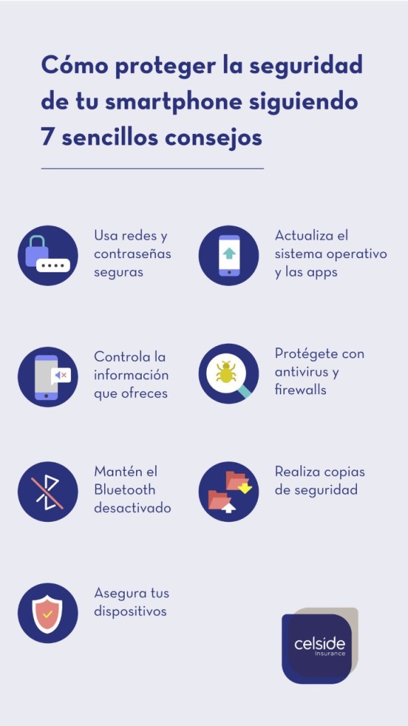 Sin embargo, no es suficiente si tenemos en cuenta otras amenazas relacionadas con los ciberataques que hacen vulnerable la seguridad del teléfono móvil. Celside Insurance, te ofrece 7 consejos que todos los usuarios pueden seguir para proteger su smartphone de forma fácil.