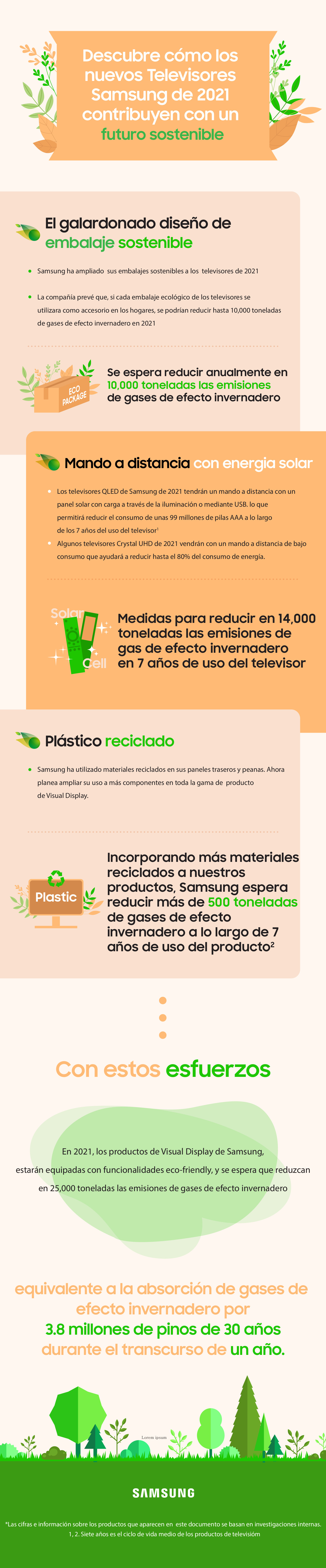 Samsung se ha embarcado en un viaje de sostenibilidad que pone el medio ambiente en un lugar fundamental en todas las operaciones empresariales con varios programas de sostenibilidad a largo plazo, que incluyen el diseño de embalajes sostenibles, mandos a distancia con paneles solares y la reducción de la huella de carbono mediante el uso de materiales reciclados.