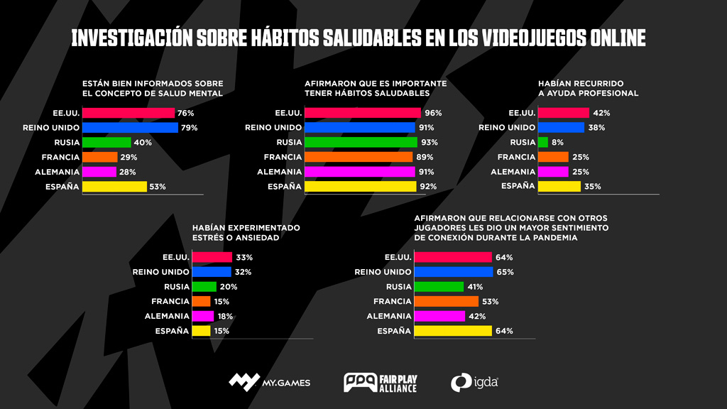 El 53% de los jugadores de España estaban familiarizados con el concepto de salud mental y un 92% creen necesario dedicar esfuerzos a su cuidado. Como contraste, en países del entorno como Reino Unido, solo un 79% de los encuestados dicen tener suficiente información previa. Cuidar de la salud mental es importante para los gamers españoles; un 91% de los encuestados en España se suman a esta afirmación.