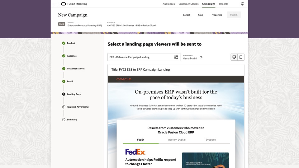 · Simplificación de la configuración de la campaña: Fusion Marketing proporciona una única interfaz de usuario para asignar todos los activos de la campaña necesarios para ejecutarla en el correo electrónico, las páginas de destino del sitio web y los canales de publicidad. Anteriormente, las empresas tenían que depender de múltiples sistemas para hacer esto mismo.