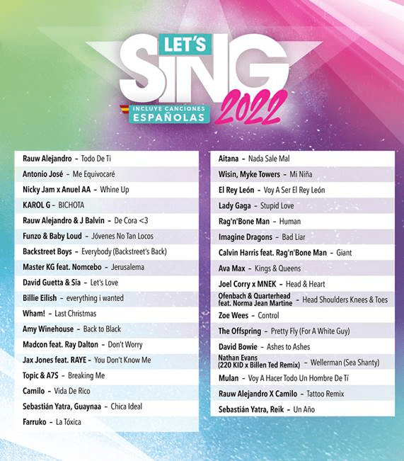 Let’s Sing 22 Incluye Canciones Españolas se estrenará en noviembre de 2021 en PlayStation®4, la familia de dispositivos Xbox One incluyendo Xbox One X y Nintendo Switch™, y también en PlayStation®5, siendo el primer juego de karaoke disponible en la nueva generación de consolas. También se podrá jugar en las plataformas Xbox Series X/S.