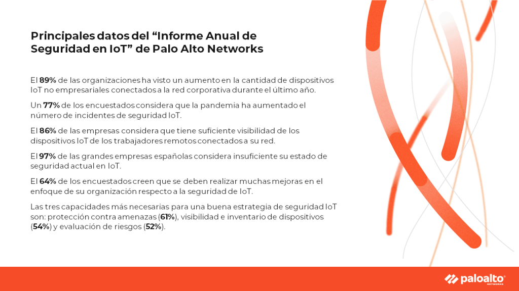 El aumento del trabajo remoto durante la pandemia de la COVID-19 ha provocado un aumento en el número de dispositivos Internet de las cosas (IoT) no comerciales en las redes corporativas. En este contexto, según los datos del “Segundo Informe Anual de Seguridad en IoT” de Palo Alto Networks (1), el 97% de las grandes empresas españolas que tienen dispositivos IoT conectados a la red de su organización, consideran que su seguridad IoT requiere mejoras.
