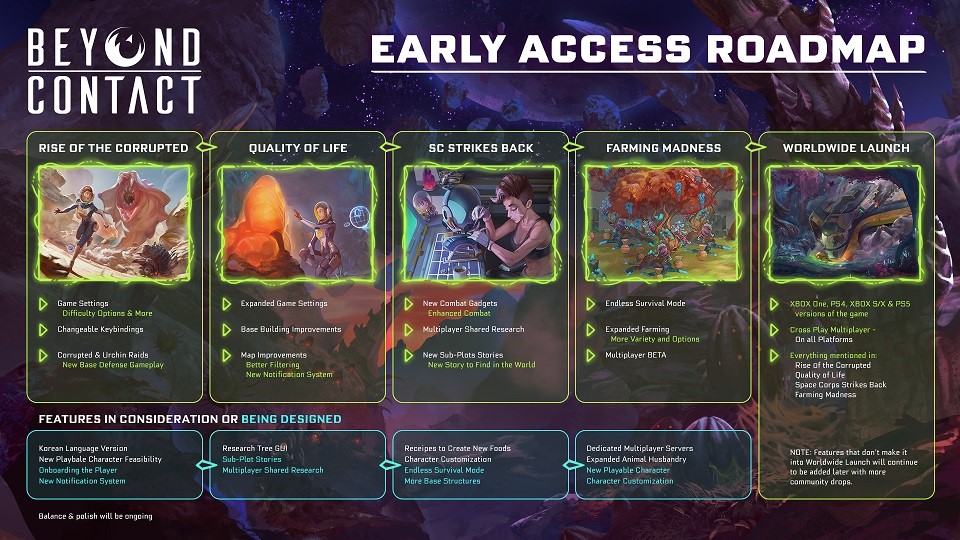 En el día de hoy, Koch Media y el desarrollador Playcorp han desvelado la hoja de ruta que resume la fase de acceso anticipado de Beyond Contact. También se ha anunciado que la aventura de supervivencia de ciencia ficción se lanzará en PlayStation 4, PlayStation 5, Xbox One y Xbox Series S|X y contará con la opción de juego multijugador cruzado en todas las plataformas.