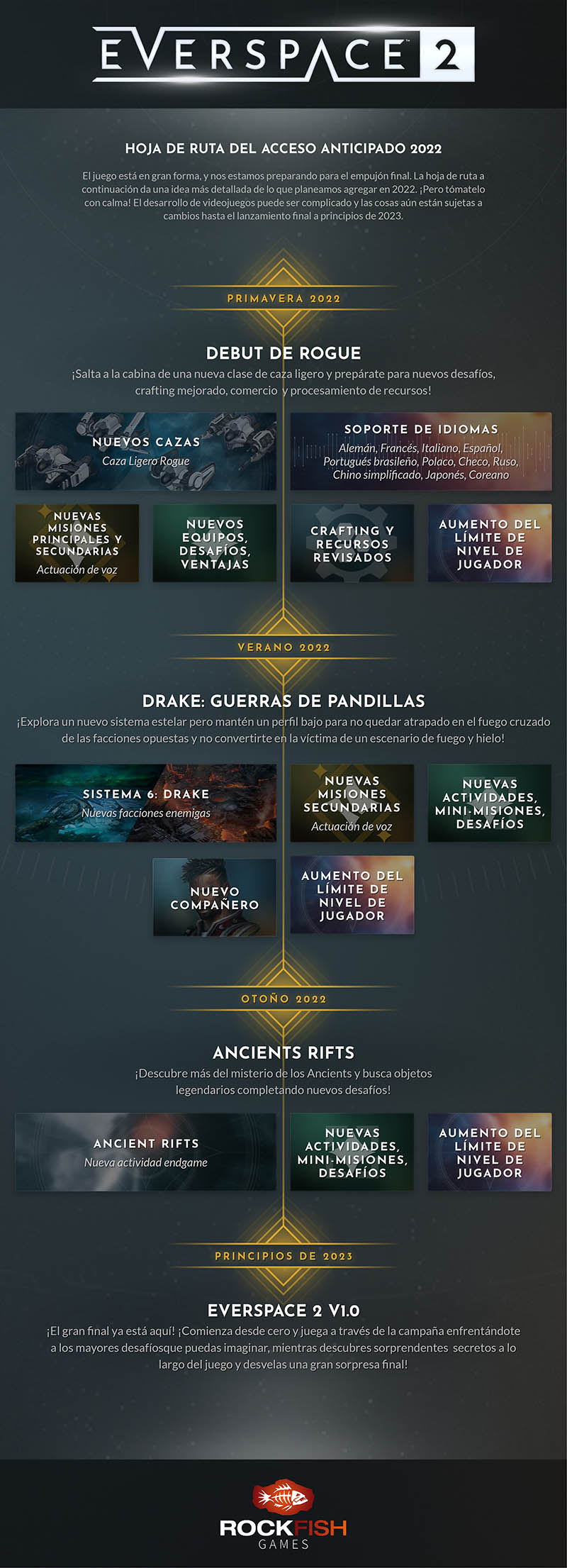 El estudio de videojuegos independientes ROCKFISH Games anuncia los primeros detalles sobre lo que está por llegar a su aclamado shooter looter espacial, EVERSPACE 2, en 2022. La hoja de ruta del próximo año revela más detalles sobre las actualizaciones del Acceso Anticipado y del Xbox Game Pass para PC. Los jugadores se harán una idea clara sobre en qué están trabajando los desarrolladores antes del lanzamiento oficial, que llegará a principios de 2023.