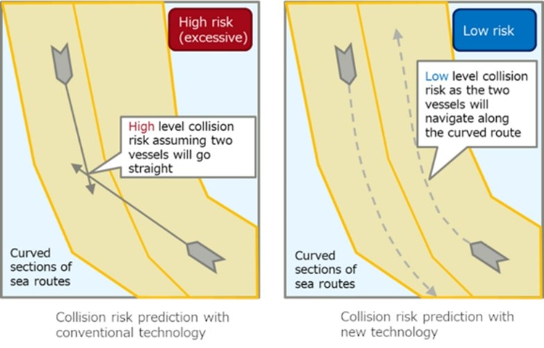 Sin embargo, la mayoría de los métodos de predicción de riesgos de colisión de buques que se utilizan actualmente en la práctica tienen en cuenta que los buques navegan en línea recta partiendo de sus posiciones actuales. En consecuencia, es frecuente que se produzcan alertas innecesarias cuando un buque navega por tramos curvos de las rutas marítimas, definidas oficialmente por leyes y reglamentos como la Ley de Seguridad del Tráfico Marítimo. Por lo tanto, el momento correcto de las notificaciones de riesgo a los buques depende de la experiencia y la habilidad del controlador de operaciones.