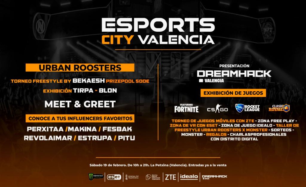 El próximo sábado 19 de febrero se celebra Esports City Valencia, el primer evento presencial de Esports City League, la primera liga del mundo de esports entre ciudades vinculada a DreamHack España. Este evento servirá como punto de encuentro de la juventud valenciana, que podrá disfrutar de un montón de actividades relacionadas con los videojuegos, la música más urbana y la posibilidad de conocer a importantes influencers como Perxitaa, Makina o los Urban Roosters, además de talleres, charlas, una zona de realidad virtual, un simulador de Fórmula 1 y torneos de esports para móviles.