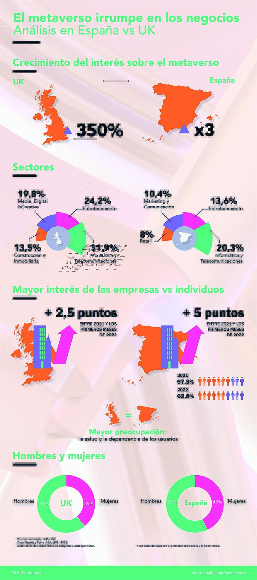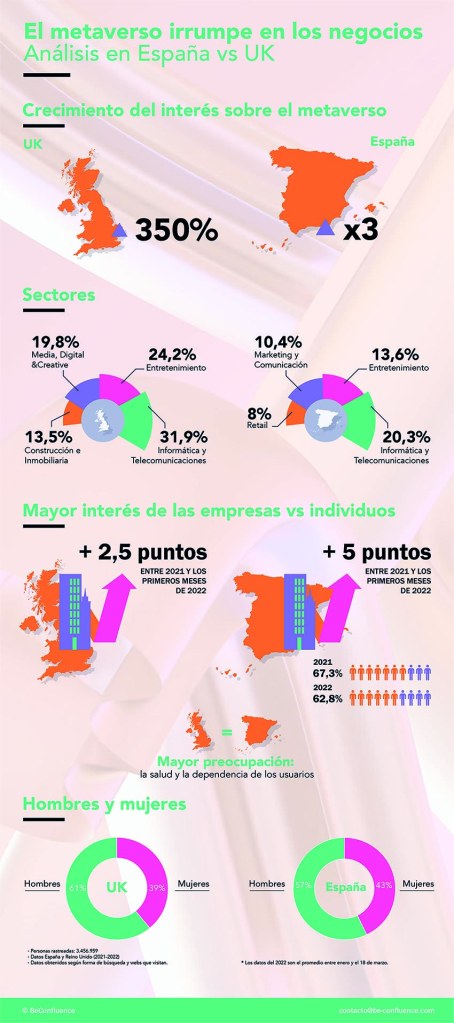 La agencia de comunicación y asuntos públicos BeConfluence ha llevado a cabo el primer informe en profundidad sobre el metaverso basado en un análisis de datos de búsquedas en internet con un algoritmo desarrollado por BeConfluence sobre más de 4,3 millones de IP de usuarios únicos. El trabajo se ha basado fundamentalmente en búsquedas realizadas en España en 2021 y el primer trimestre de 2022, con referencias desde 2016.