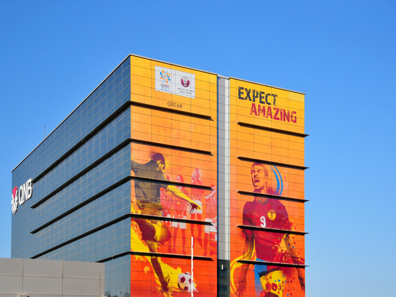 Doha, Qatar: Qatar National Bank QNB offices – architect Marwan Zgheib – Qatar soccer world cup decoration (2022 FIFA World Cup) – facade on Abdullah Bin Jassim Street