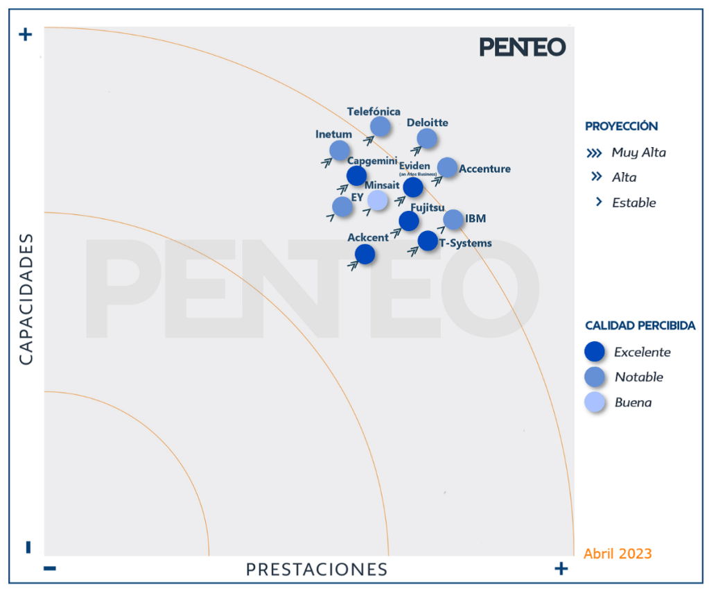 El informe ha evaluado en su marco de análisis el posicionamiento de las compañías seleccionadas en función de 4 dimensiones: las capacidades según el volumen de negocio, el delivery, el equipo y la aproximación al mercado. También considera las prestaciones sobre la cobertura del porfolio, el alcance de los servicios, las herramientas y las metodologías utilizadas, y las alianzas y activos.