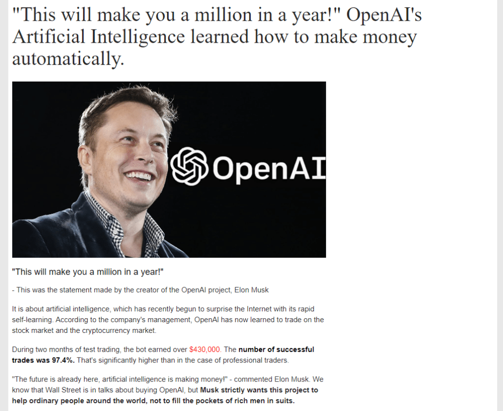 Los investigadores de Avast han descubierto un nuevo tipo de estafa que utiliza nombres de celebridades como el magnate Elon Musk para atraer a la gente a invertir a través de una plataforma falsa. Esta vez, los estafadores atraen a sus víctimas mediante el uso de inteligencia artificial, que supuestamente permite a la plataforma operar en el mercado de valores y criptomonedas.