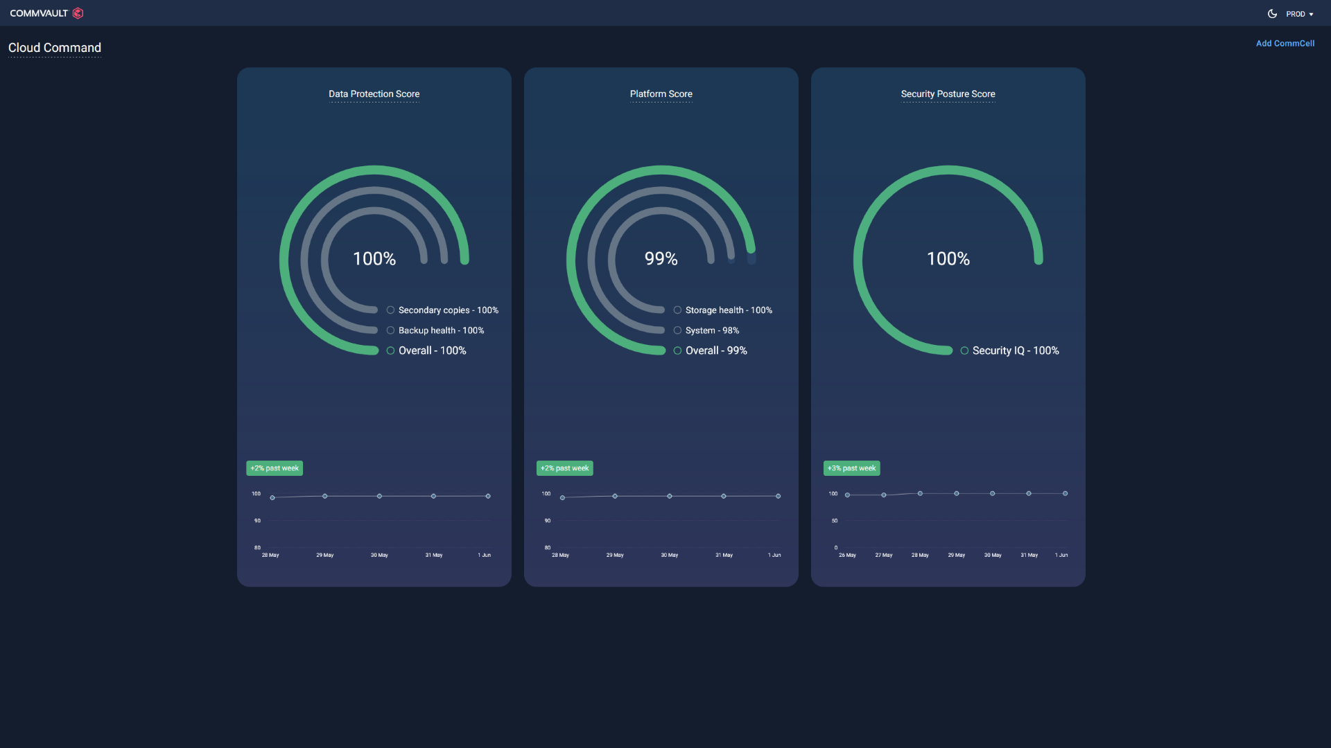· Commvault Cloud Command – Una única plataforma con una única interfaz de usuario, que ofrece gestión universal para todas las ofertas de Commvault en un panel integrado. Proporciona telemetría completa y capacidad de observación de los indicadores clave del software de Commvault. Ofrece indicadores de estado, niveles de riesgo, seguridad y recuperación, y mucho más, desde una única fuente.