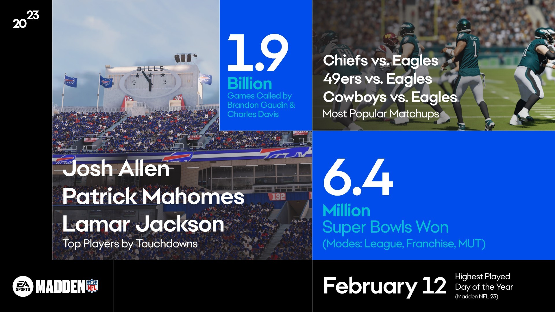 En 2023, Los Sims™ 4 se convirtió en el juego más jugado en los 23 años de historia de la franquicia. Madden NFL siguió acogiendo a más aficionados al fútbol americano, ya que Madden NFL 24 atrajo a más jugadores durante la primera semana de lanzamiento en comparación con su anterior entrega. El equipo de Respawn Entertainment lanzó el siguiente capítulo de la historia de Cal Kestis, Star Wars Jedi: Survivor. Por último, pero no menos importante, defendiendo una nueva cultura de juego, la franquicia y franquicia móvil más populares del año de EA han sido EA SPORTS FC™ y EA SPORTS FC™ Mobile.
