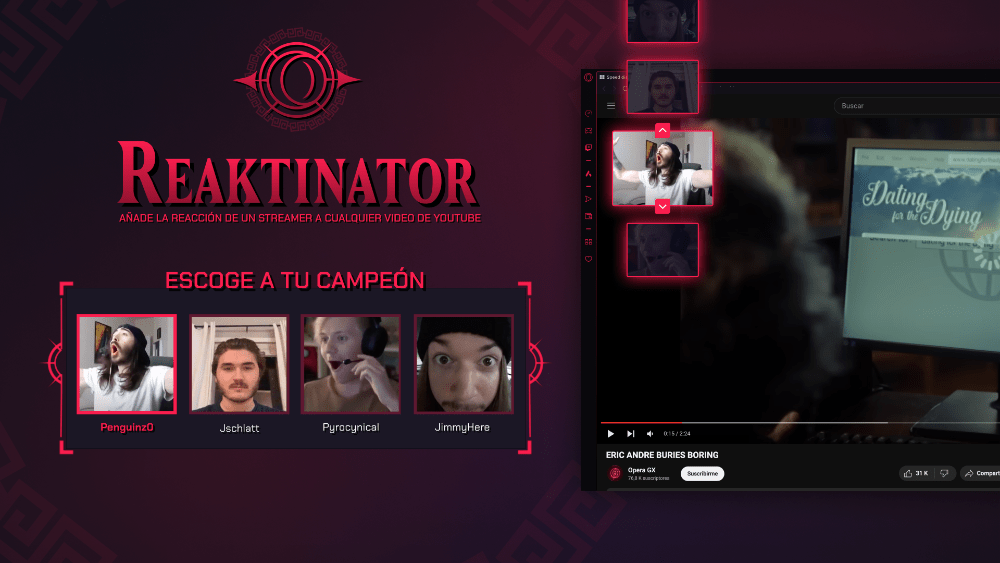 ¿Te has quedado alguna vez perplejo, indignado o simplemente desconcertado ante un vídeo de YouTube, sin saber cómo reaccionar? En Opera GX, también. Con «Reaktinator«, la última funcionalidad del navegador para gamers los usuarios van a poder añadir sus propios vídeos, creando una gran variedad de reacciones personalizadas mientras ven YouTube.