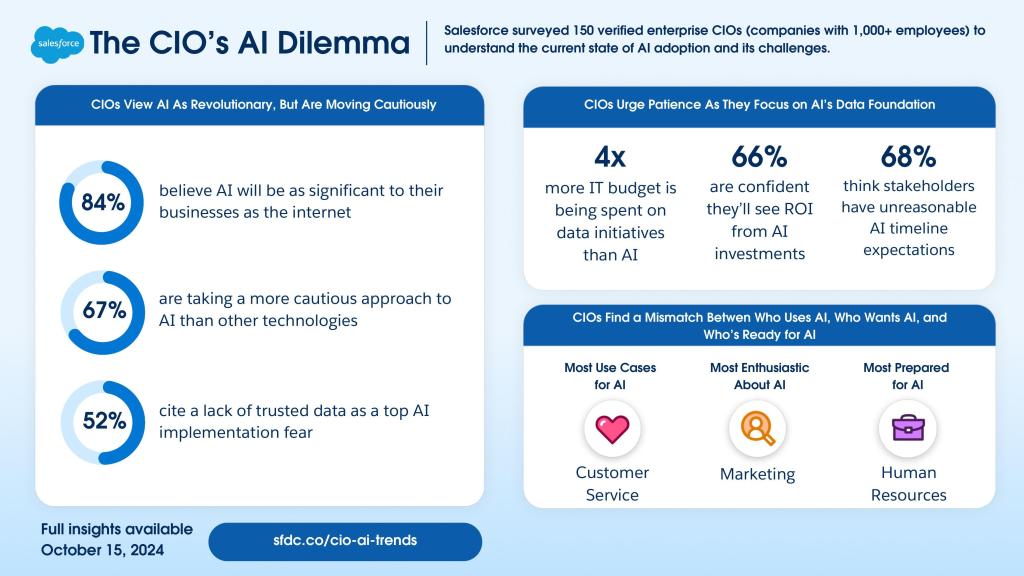 · Los CIO están de acuerdo en que la IA cambiará las reglas del juego, pero se muestran cautelosos. El 84% cree que la IA será tan importante para las empresas como Internet, pero el 67% está adoptando un enfoque más cauteloso en comparación con otras tecnologías.