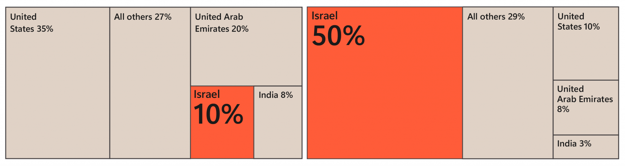 Aparte de EE.UU. y Reino Unido, la mayor parte de la actividad de ciberamenazas afiliadas a estados-nación que observamos se concentraba en torno a Israel, Ucrania, Emiratos Árabes Unidos y Taiwán. Además, Irán y Rusia han utilizado, tanto la guerra entre Rusia y Ucrania como el conflicto entre Israel y Hamás, para difundir mensajes divisivos y engañosos a través de campañas de propaganda que extienden su influencia más allá de los límites geográficos de las zonas de conflicto, lo que demuestra la naturaleza globalizada de la guerra híbrida.