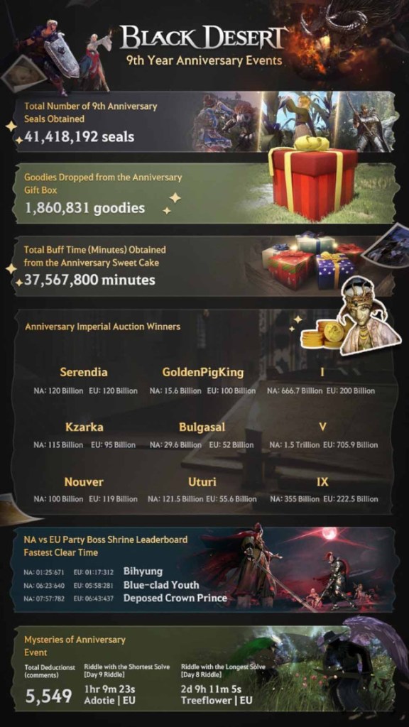 Pearl Abyss conmemora el 9º aniversario del lanzamiento de Black Desert en Occidente con un mes de celebraciones y una infografía que destaca los logros de la comunidad. Esta imagen llena de datos recopila los hitos más importantes del evento, reflejando la magnitud de las recompensas obtenidas por los aventureros durante la celebración.