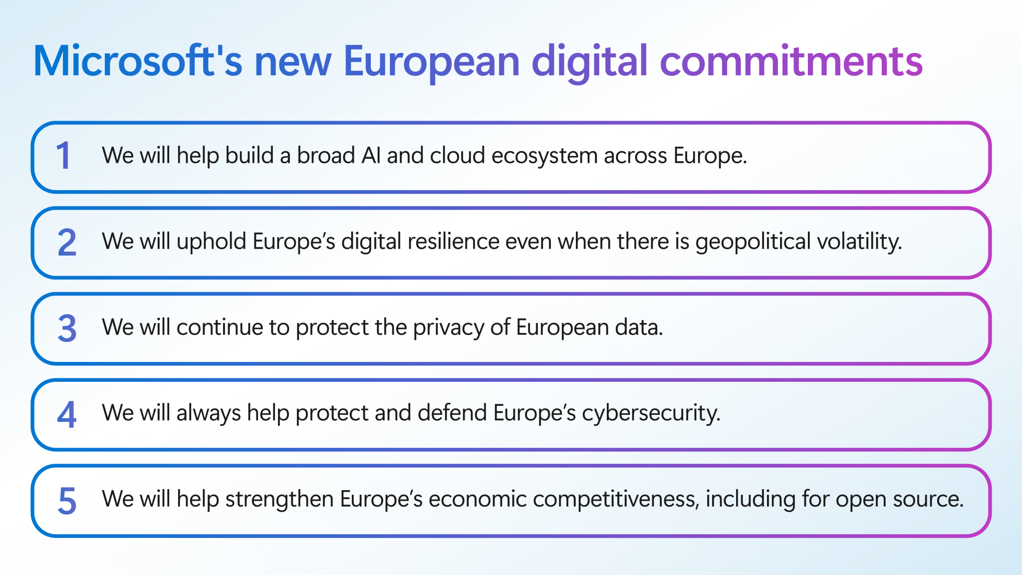En tiempos de volatilidad geopolítica, nos comprometemos a proporcionar estabilidad digital. Por eso Microsoft anuncia hoy cinco compromisos digitales con Europa. Estos comienzan con una expansión de nuestra infraestructura de nube e IA en Europa, destinada a permitir que cada país utilice plenamente estas tecnologías para fortalecer su competitividad económica. E incluyen la promesa de mantener la resiliencia digital de Europa independientemente de la volatilidad geopolítica y comercial.