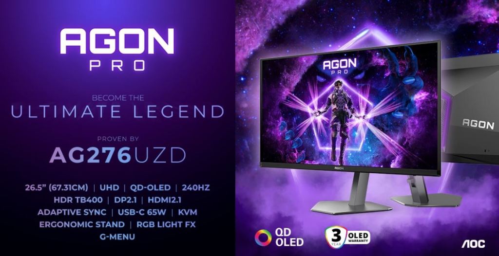 AGON by AOC – la marca líder mundial de monitores para juegos – anuncia AGON PRO AG276UZD, un nuevo monitor para juegos QD-OLED de 26,5 pulgadas (67,31 cm) que lleva la resolución UHD (3840×2160) al formato ampliamente favorecido de 240 Hz. Basándose en el éxito del popular AG276QZD2, este nuevo modelo AGON PRO combina imágenes ultra nítidas con una excepcional frecuencia de actualización de 240 Hz y un tiempo de respuesta GtG ultrarrápido de 0,03 ms, ofreciendo una claridad excepcional tanto para los deportes electrónicos competitivos como para la creación de contenido profesional.