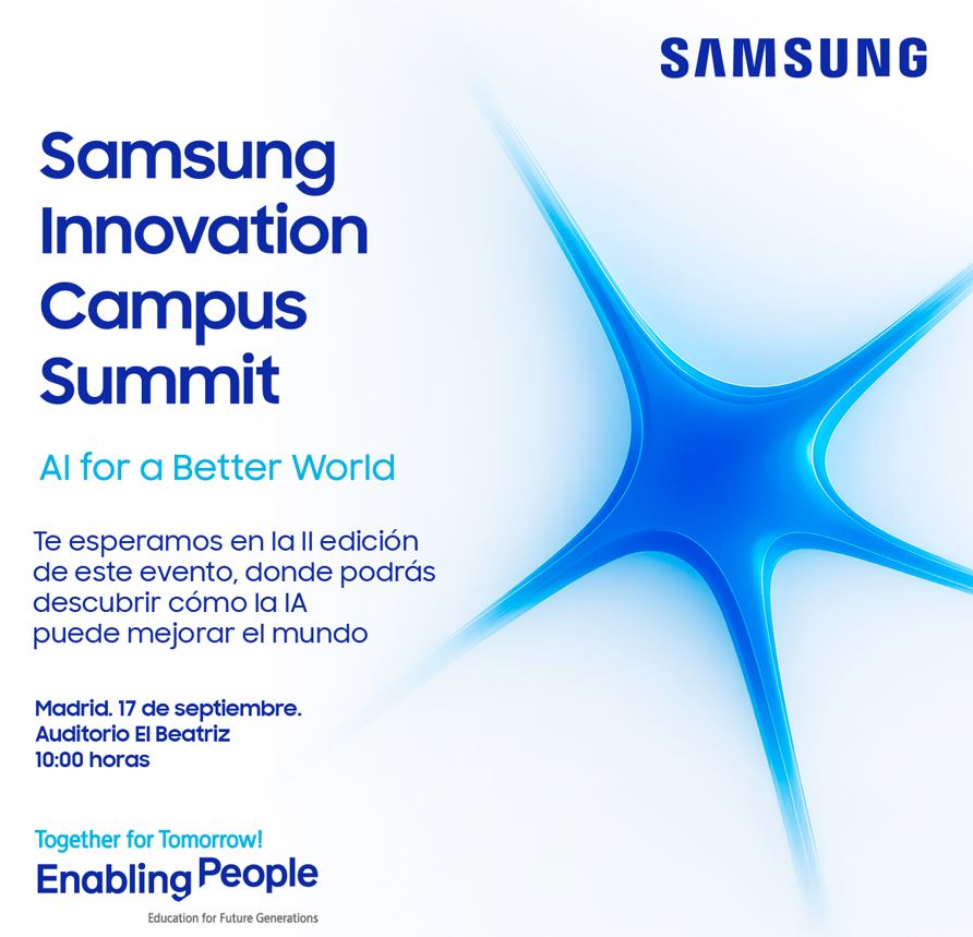 Samsung Electronics Iberia ha anunciado la celebración de la segunda edición de su evento ‘Samsung Innovation Campus Summit: AI for a Better World’, que tendrá lugar el próximo miércoles 17 de septiembre, en Madrid. La compañía reafirma así su compromiso con el uso de la tecnología y, en concreto, el uso más humanista de la inteligencia artificial para conseguir una sociedad mejor.