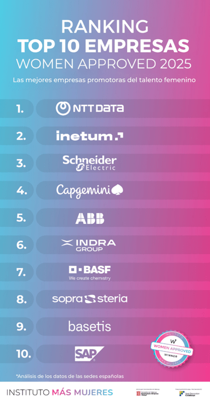 Sopra Steria, compañía líder en consultoría, servicios digitales y desarrollo de software, ha sido reconocida con el sello Women Approved 2025 y se ha posicionado en el puesto número 8 del ranking de las “10 mejores empresas para el talento femenino”, elaborado por el Instituto Más Mujeres.
