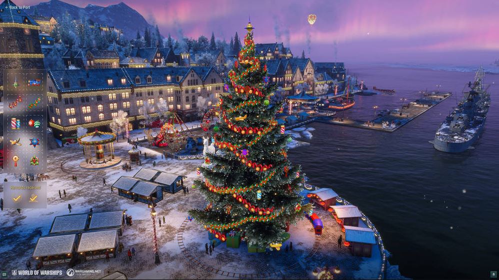 La celebración continúa en World of Warships: Legends con la llegada del Puerto Ciudad de Santa. Los jugadores podrán conseguir una nueva moneda temática, las Fichas Alegría, que se podrán obtener al completar diversas actividades. Con esta moneda temática, los jugadores podrán desbloquear decoraciones para el Puerto y recompensas de temporada. Entre estas recompensas destacan las nuevas pinturas Frozen, nuevas apariencias para comandantes (incluida Unfreezable Sam) y las cajas místicas, que podrán desbloquear barcos raros y de Edición Especial, como los navíos: Incomparable, Aki y Marceau.