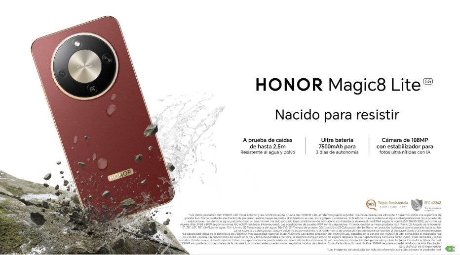Posicionado como el smartphone más resistente del mercado, el último HONOR Magic8 Lite presenta una resistencia total a caídas, agua y polvo con la primera certificación SGS Triple Resistente Premium Performance Certification[1] del sector. Al igual que la generación anterior, el dispositivo también cuenta con la prestigiosa certificación SGS 5-Star Comprehensive Reliability Certification[2] , que garantiza que puede soportar caídas desde alturas de hasta 2,5 metros[3] sobre determinadas superficies. Además, su diseño y estructura reforzada con la tecnología anticaída HONOR Ultra-Bounce, e innovación con fluido no newtoniano para una protección avanzada y nuevo cristal templado ultrarresistente para proteger el móvil a caídas sobre 10 tipos diferentes de superficies de piedra e incluso de disparos con pistolas de aire comprimido.