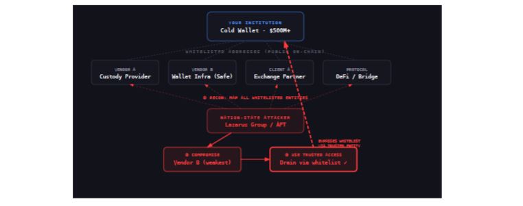 Para un atacante con recursos estatales, la transparencia de la cadena de bloques es un regalo. Al analizar los patrones de transacciones públicas, el grupo Lazarus puede mapear exactamente qué proveedores de custodia, infraestructuras de billetera o protocolos DeFi utiliza una institución.