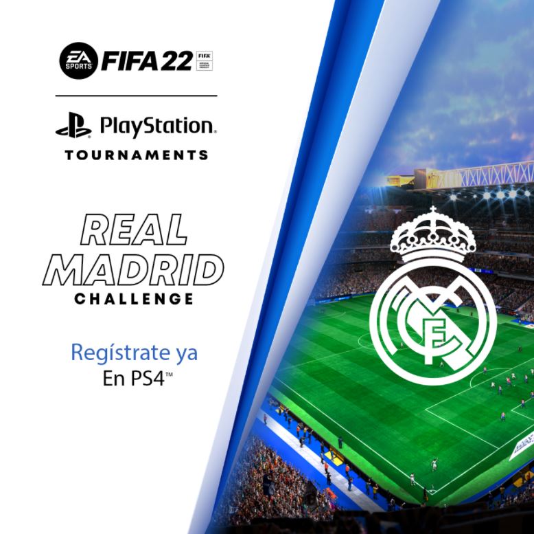Sony Interactive Entertainment anuncia la llegada del desafío Real Madrid Challenge a PlayStation®Tournaments, en el que podrán participar* los jugadores de EA Sports™ FIFA 22 en PlayStation®4 (PS4™) sea cual sea su nivel de experiencia con el título, de forma totalmente gratuita y optar a grandes premios como crédito PSN, una PlayStation®5 (PS5™) o un Meet and Greet virtual con un jugador del Real Madrid.* Se requiere una suscripción activa a PlayStation® Plus para participar en los torneos. Es necesario tener la edad requerida y residir en un país válido. Ver las reglas completas en la página de inscripción de cada torneo.
