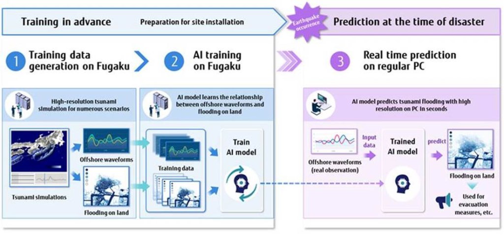 El Instituto Internacional de Investigación de la Ciencia de los Desastres de la Universidad de Tohoku, el Instituto de Investigación de Terremotos de la Universidad de Tokio y Fujitsu Laboratories han anunciado el desarrollo exitoso de un modelo de IA, que permitirá a los equipos de gestión de desastres predecir las inundaciones por tsunami en las zonas costeras, casi en tiempo real, aprovechando la potencia de cálculo del superordenador más rápido del mundo (1), Fugaku, desarrollado conjuntamente por RIKEN y Fujitsu.