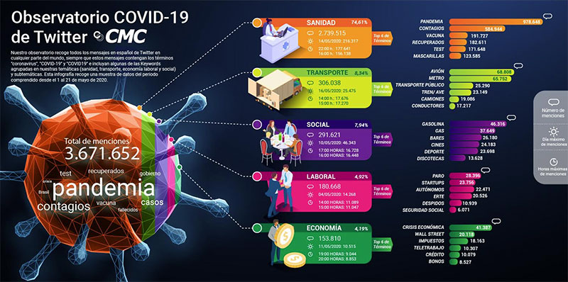 A punto de cumplirse 12 semanas de la declaración del estado de alarma y en paralelo al proceso de desescalada iniciado el pasado 4 de mayo, las temáticas de ámbito social y de transporte han ido ganando peso en la conversación en Twitter sobre el COVID-19 aunque la sanidad sigue siendo la gran protagonista. Así lo refleja la tercera oleada del Observatorio #COVID19 de Twitter, puesto en marcha por la consultora tecnológica Grupo CMC el pasado 23 de marzo.