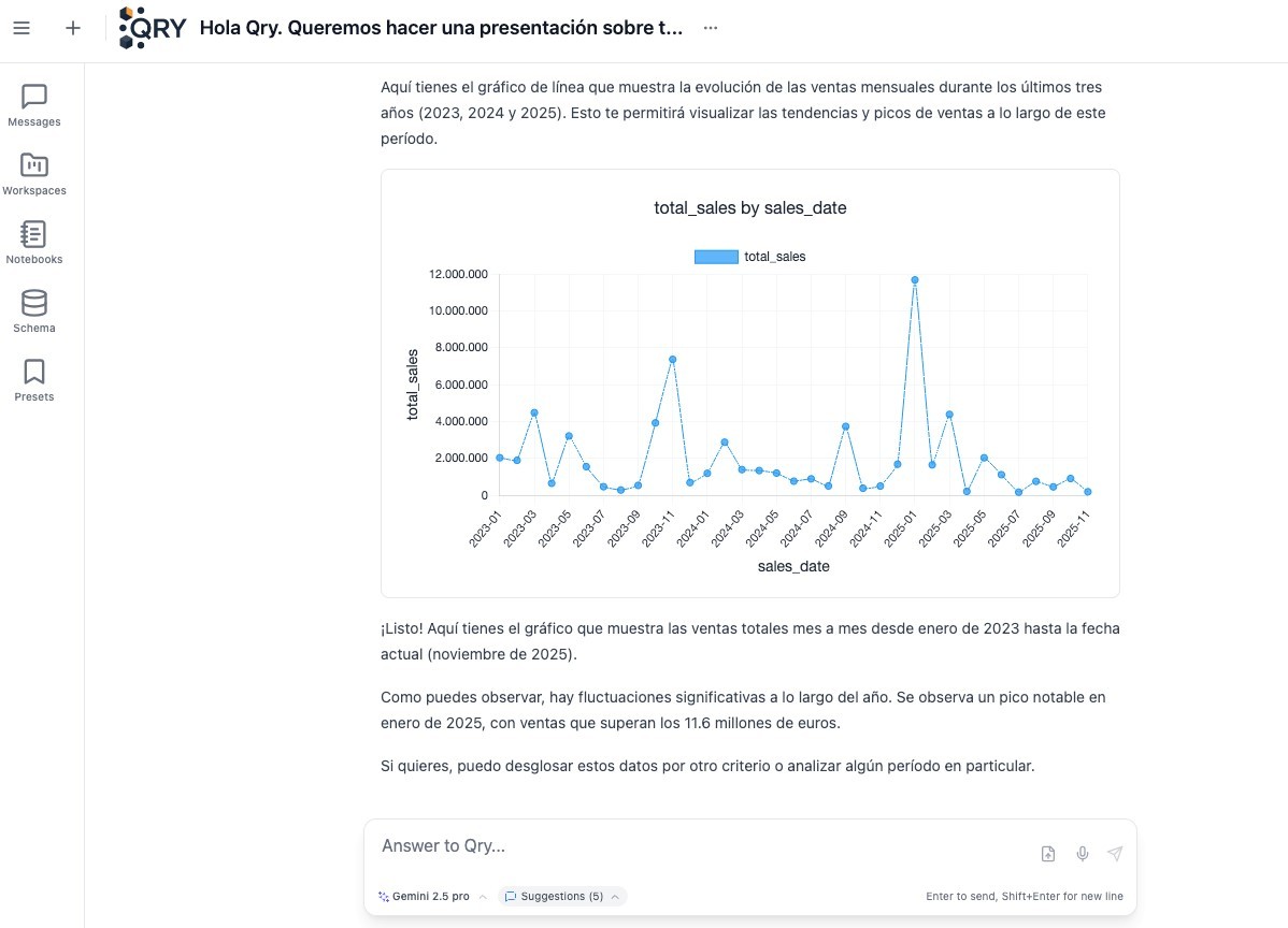 PUEDATA, empresa española especializada en soluciones de datos e IA, anuncia el lanzamiento de QRY, una plataforma de inteligencia artificial conversacional que unifica el conocimiento de toda la organización. Utilizando modelos avanzados ya desarrollados como GPT-5 o Gemini 2.5 Pro, QRY permite aprovechar al máximo el potencial de la IA en un entorno privado con todos los datos de tu organización garantizando seguridad y cumplimiento normativo.