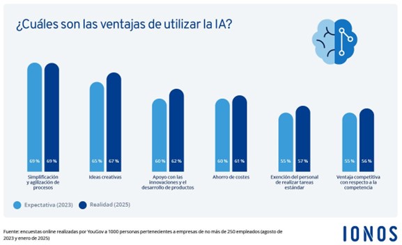 La Inteligencia Artificial se está convirtiendo rápidamente en parte de nuestra vida cotidiana y se está abriendo camino cada vez más en el mundo empresarial. En España, las pymes ya están adoptando este cambio, reconociendo la IA como un motor crucial de su transformación digital y su competitividad futura. Así lo revela el último estudio de digitalización de YouGov para IONOS, que muestra un incremento del 10% en la adopción de herramientas de IA respecto al año anterior, alcanzando ya al 32% de las empresas que está usando herramientas de IA en el presente. Esta cifra sitúa a España por encima de Francia (26%), a la par que Alemania (32%) y ligeramente por debajo del Reino Unido (37%).