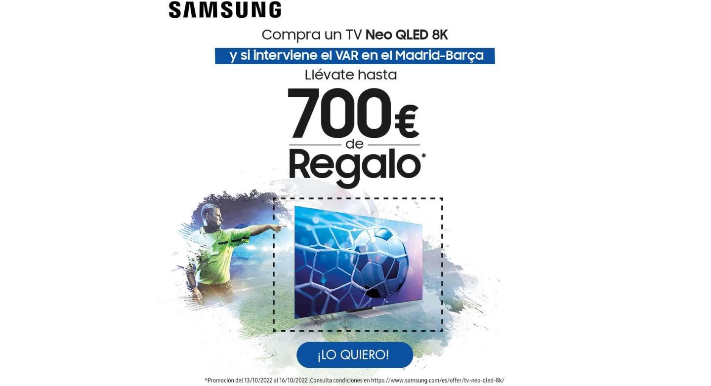Samsung Electronics Co., Ltd va a añadirle aún más emoción al Clásico de La Liga el próximo 16 de octubre. Aquellas personas que hayan comprado un televisor Neo QLED 8K del 13 al 16 de octubre[1], ambos incluidos, podrán hacerse con un descuento cash back en función de la actuación del VAR que se produzca durante el partido del Real Madrid – Barça.