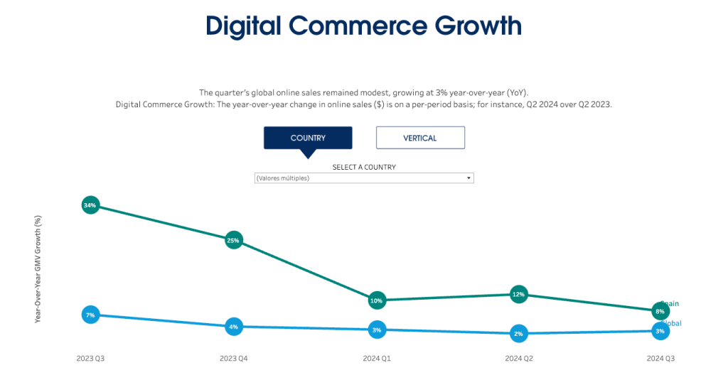 Según el Shopping Index de Salesforce -que analiza datos de más de 1.500 millones de consumidores del mercado minorista de todo el mundo- las ventas globales por internet en el tercer trimestre del año crecieron un 3% respecto al año pasado. El crecimiento en España ha sido de un 8% en el tercer trimestre de 2024, superando en 5 puntos la media global. Por su parte, la tasa de conversión en España fue del 1.5% frente al 1.8% global.