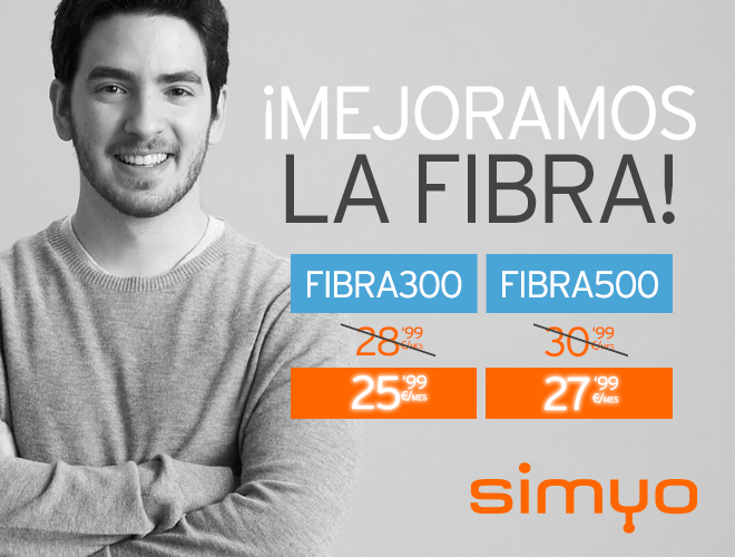 En simyo sabemos que te gusta estar informado de lo que hacemos, así que te mandamos el resumen de nuestro último lanzamiento, para que estés siempre a la última. Fibra 500 por solo 30,99€ Ya sabes que en simyo no podemos estarnos quietos. Por eso, después de la fibra de 100 y la fibra de 300, aceleramos y metemos una marcha más: ¡llegan los 500Mbps! Por solo 30,99€. Así que ahora tenemos una fibra más rápida, más potente, más… ¡Fiuuuuummmmmmm! 😉