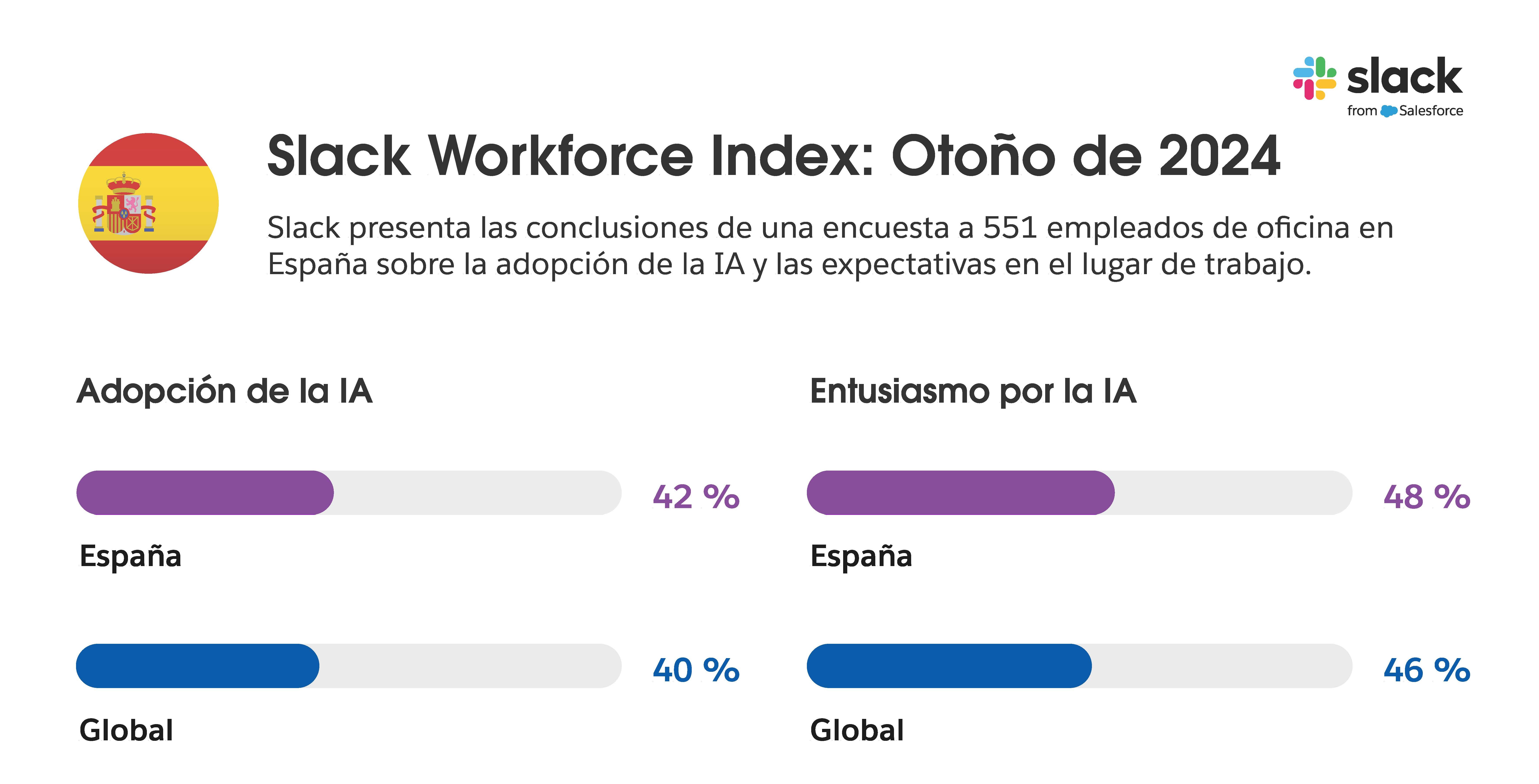 La última edición del estudio Slack Workforce Index revela un aumento significativo en la adopción de la IA, además de un creciente entusiasmo entre los trabajadores de oficina, con un aumento del uso diario de la IA en un sorprendente 233% en sólo seis meses. La encuesta, realizada a más de 5.000 trabajadores de todo el mundo, también afirma que la IA se ha convertido en una clara ventaja competitiva, ya que los trabajadores que la utilizan a diario son un 64% más productivos y están un 81% más satisfechos con su trabajo que los compañeros que no la utilizan.