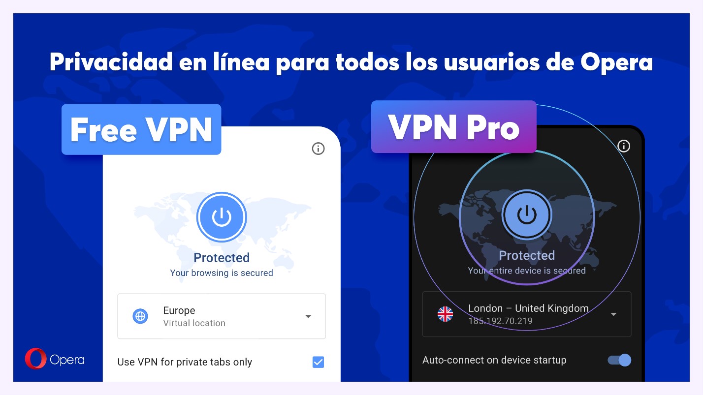 VPN Pro ofrece protección a nivel de dispositivo, permitiendo a los usuarios ocultar su ubicación y proteger su privacidad en hasta seis dispositivos con Windows, macOS o Android. VPN Pro está disponible en Opera One, Opera GX y Opera para Android. Opera ofrece VPN Pro como una alternativa de pago a su servicio VPN gratuito integrado en el navegador, que cuenta con un conjunto más limitado de ubicaciones y solo funciona dentro de la aplicación del navegador Opera.