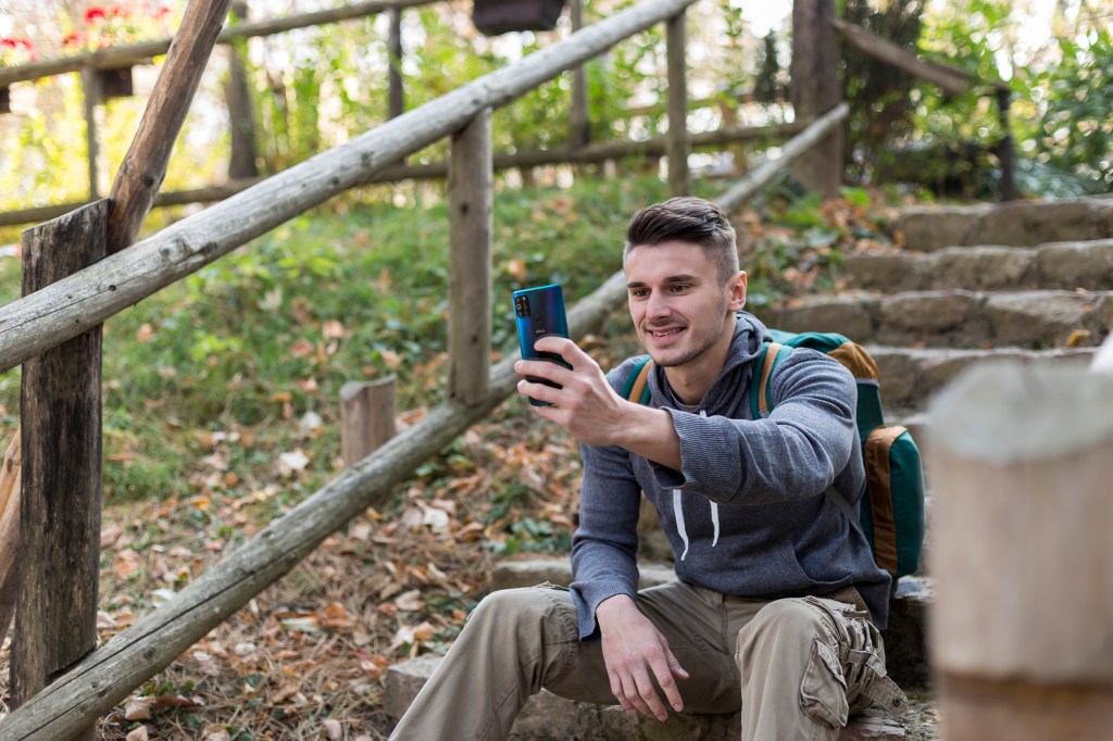 Hiking man take selfie during his walk through the forest. Travel lifestyle and outdoor recreation autumn vacations concept. Smiling young man with backpack using smartphone in forest